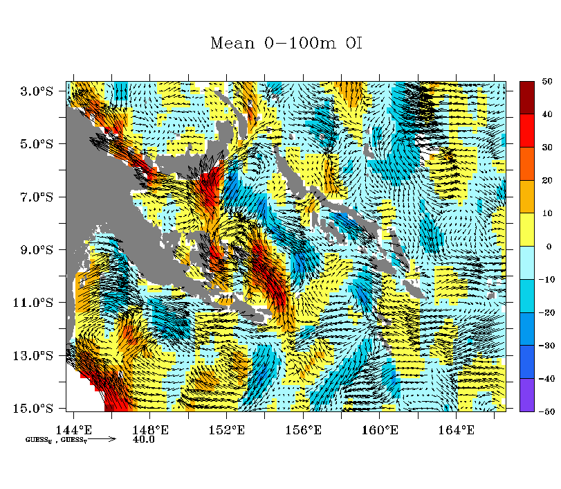 - ABSTRACT: The Solomon Sea, in the western tropical Pacific, is part of a major oceanic pathway for waters connecting the tropics to the equator via low latitude western boundary currents. Shipboard acoustic Doppler current profilers data from 94 various cruises and transits are used to describe the Solomon Sea mean circulation and its seasonal variability above 300m depth, providing an unprecedently detailed picture from observations. The circulation in the near-surface (20-100m) and thermocline (100-300m) layers were analyzed separately but found to have many similar features.